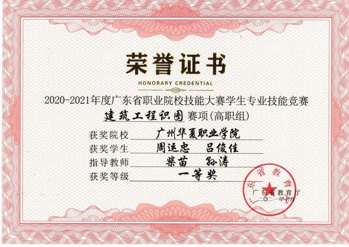 2020-2021学年广东省职业院校学生专业技能大赛建筑工程识图赛项获省级一等奖